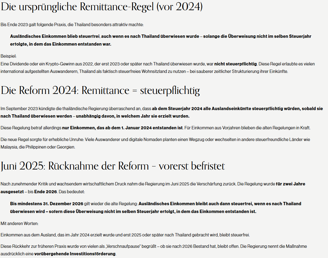 - Angeblich hätte es im Juni 2025 eine Rücknahme der Steuerreform von 2024, aber nur für 2 Jahre gegeben. Völliger Quatsch, die Steuerreform von 2024 ist mit Stand November 2025 gültig. Es gab zwar im Juni 2025 eine Absichtserklärung und diese war sogar nicht als vorübergehend eingestuft, sondern Auslandseinkommen sollte nicht zur Besteuerung in Thailand führen, wenn dieses binnen 2 Jahren nach Thailand überwiesen wird. Aber bis jetzt (November 2025) ist es weiterhin nur eine Absichtserklärung! Passend: Steuern, die die Gemüter in Thailand erhitzen.