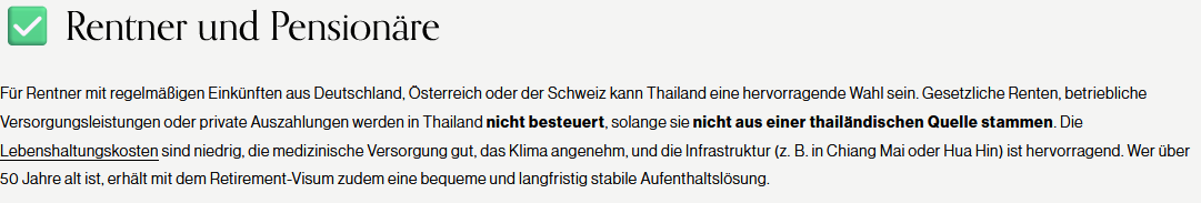 - Dann steht diese Erfindung für Menschen aus den D A CH Ländern auf der Webseite: „Gesetzliche Renten, betriebliche Versorgungsleistungen oder private Auszahlungen werden in Thailand nicht besteuert, solange sie nicht aus einer thailändischen Quelle stammen.“