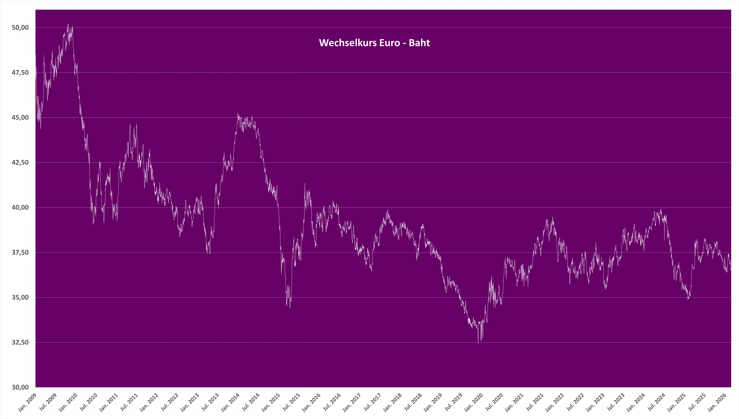 Kursentwicklung Wechselkurs Euro / Thai Baht von Jan 2009 bis Feb 2026